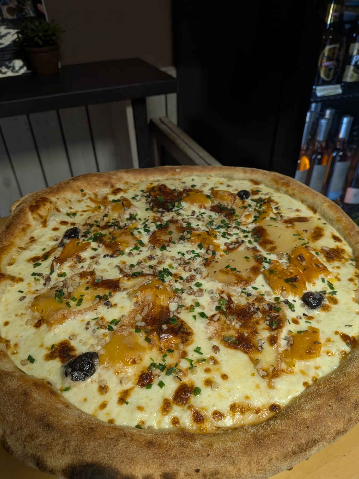 Une délicieuse création, au gré de saisons et de l’humeur du chef…. Pour ceux qui aiment varier les plaisirs ! La Ch'Ti, une pizza automnale, affirmée ! Base crême fraîche, Mozzarella, Dés de potimarron dorés au four, Maroilles, cerneaux de noix hachés.Pizza du Moment : La Ch'ti